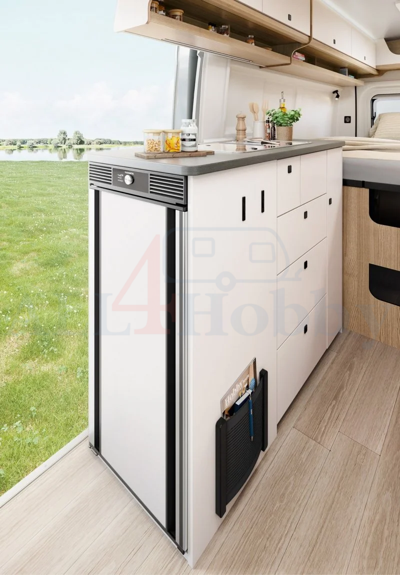 Wyjątkowy komfort: dzięki przekładanym zawiasom duża lodówka może być otwierana na dwie strony. Dzięki temu nie trzeba już będzie wchodzić do pojazdu, aby wyjąć coś z lodówki.